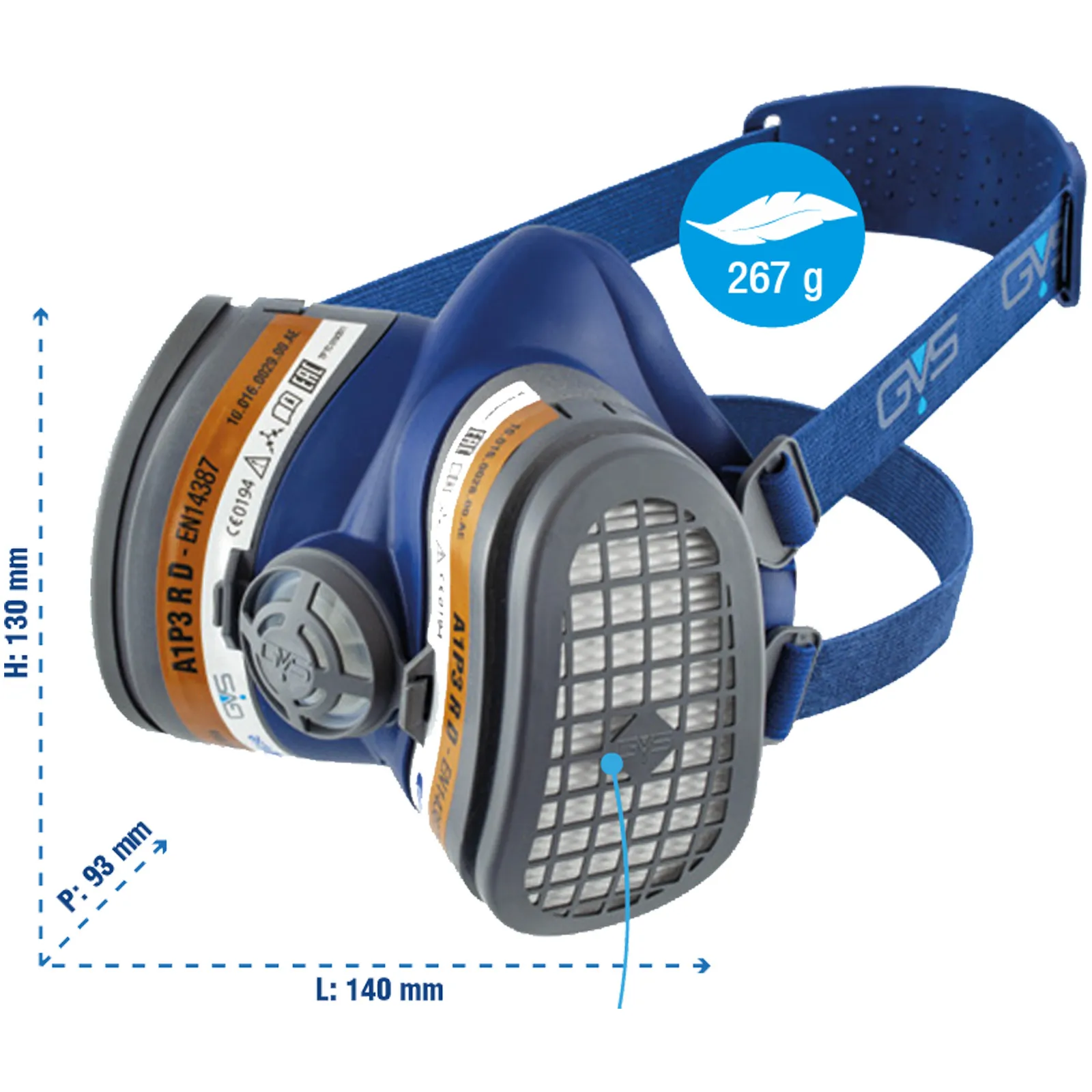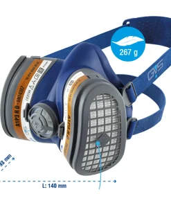 – Certificazioni EN140: 1998 + EN14387: 2004 + A1: 2008 A1P3 R D (per gas organici e polveri).