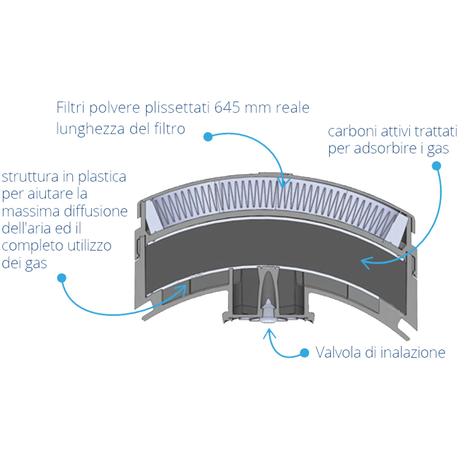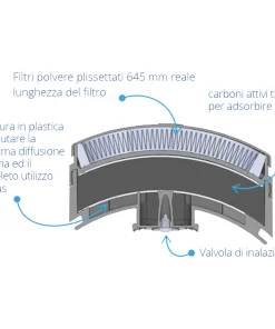 – Filtri polveri: filtro meccanico in tessuto HESPA plissettato, incapsulato in un anello in TPE.