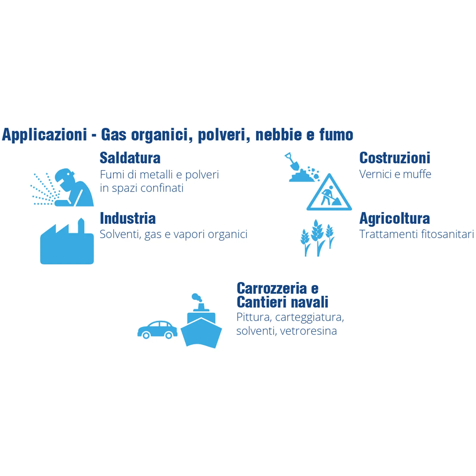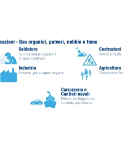 Questa maschera è consigliata per la protezione da gas organici e polveri, pesticidi, vernici, solventi nei settori Automotive, costruzioni, agricoltura, industria cantieristica e riparazioni.