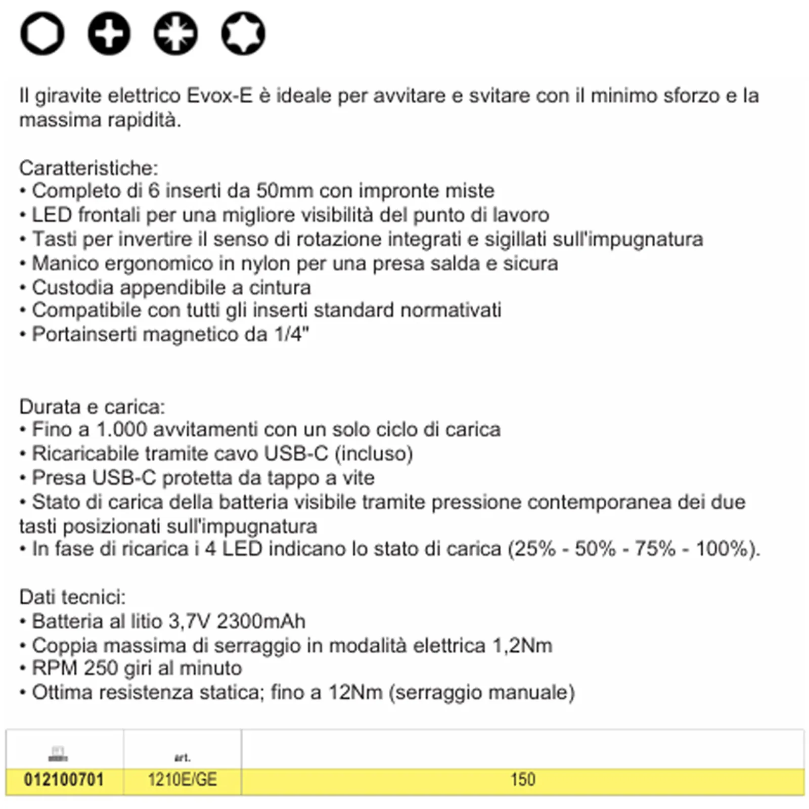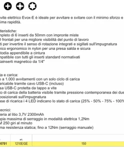 Il giravite elettrico Evox-E è ideale per avvitare e svitare con il minimo sforzo e la massima rapidità con porta-inserti magnetico da 1/4″.