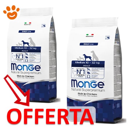 Monge Natural Superpremium Medium Adult Ricco in Pollo è un alimento completo per cani adulti di taglia media (10-32 kg). Specificamente sviluppato pensando al benessere del tuo cane, grazie alla presenza di sostanze nutritive di qualità frutto della ricerca Made in Italy. Il primo ingrediente è il pollo e la formulazione è caratterizzata da digeribilità e appetibilità grazie all’inclusione di carne fresca. La ricetta è arricchita con prebiotici di ultima generazione xilo-oligosaccaridi (XOS) per il supporto del benessere intestinale.