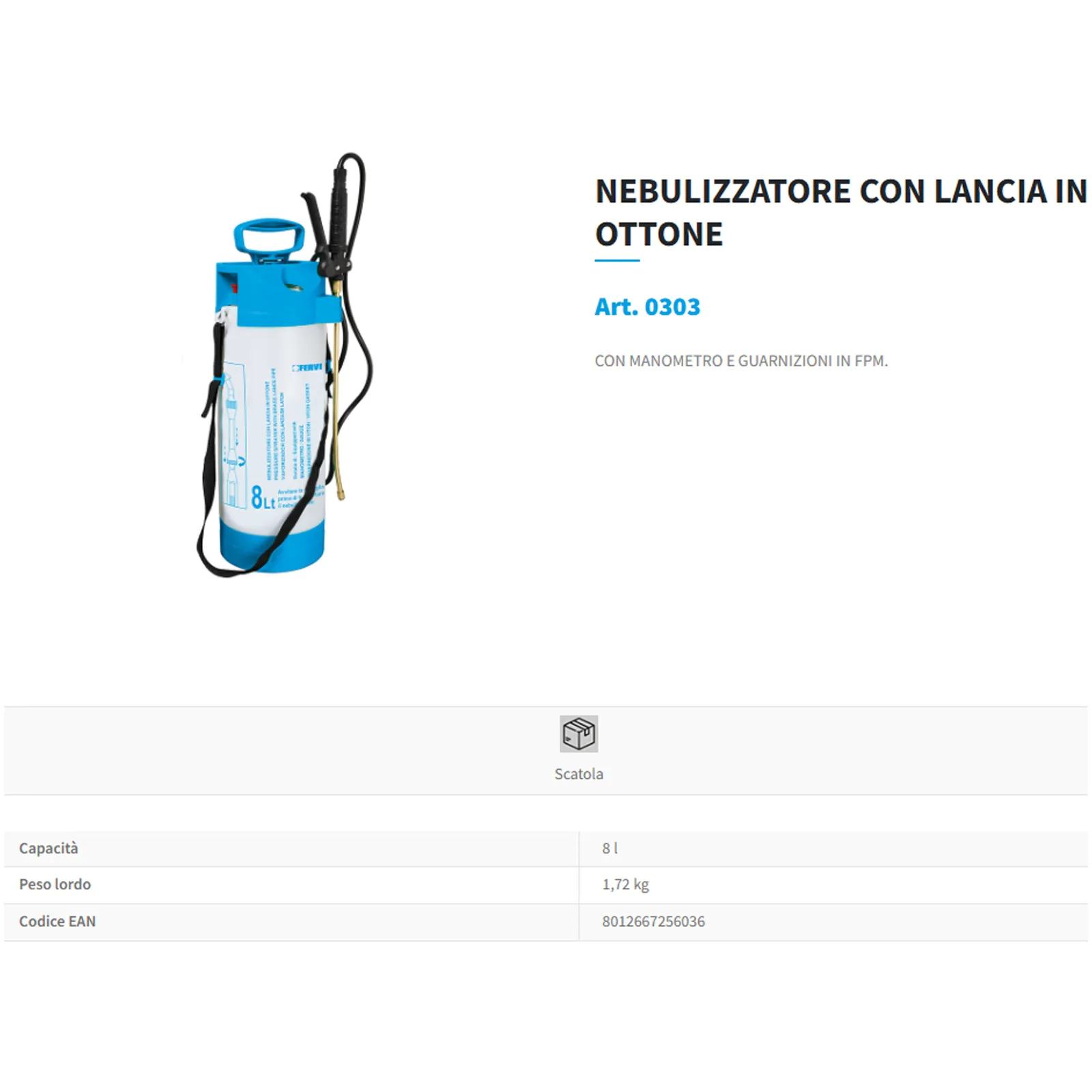 Il nebulizzatore per giardinaggio ha una capacità di 8 litri con lancia in Ottone, manometro integrato e guarnizioni in FPM della FERVI è uno strumento essenziale per chiunque desideri mantenere il proprio giardino in ottime condizioni.