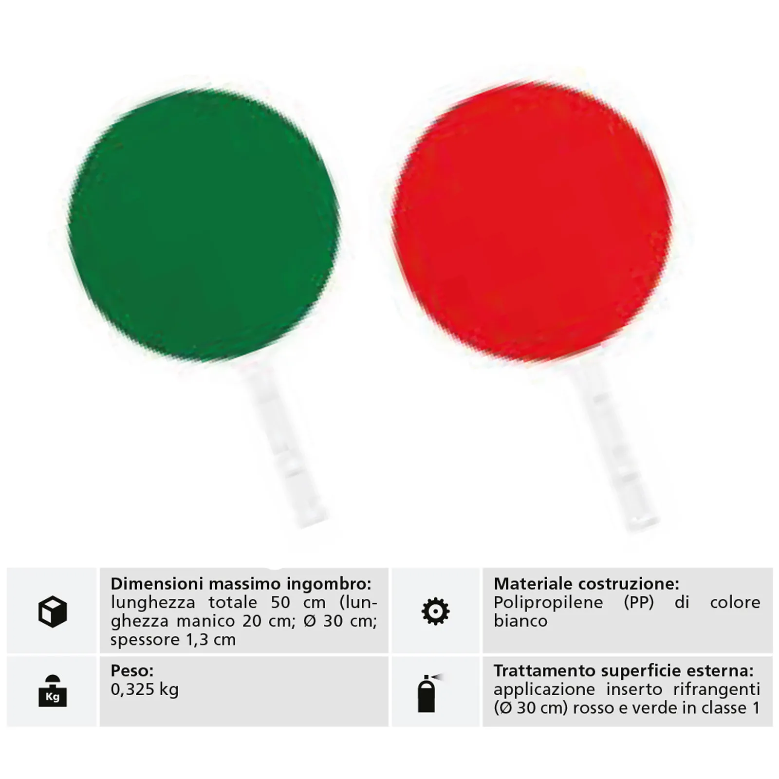 La paletta per transito alternato da movieri è realizzata in Polipropilene di colore bianco con presa inferiore ergonomica; la parte circolare è predisposta per applicare la pellicola rifrangente di colore rosso e verde.