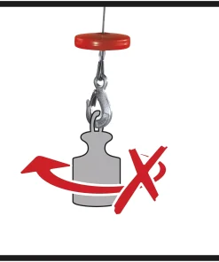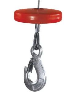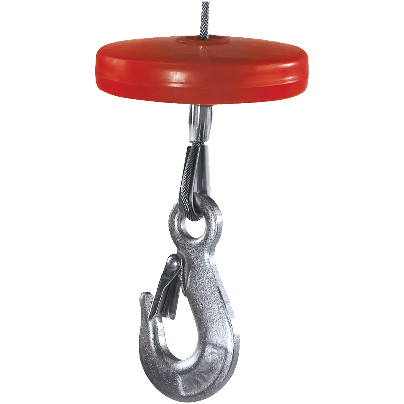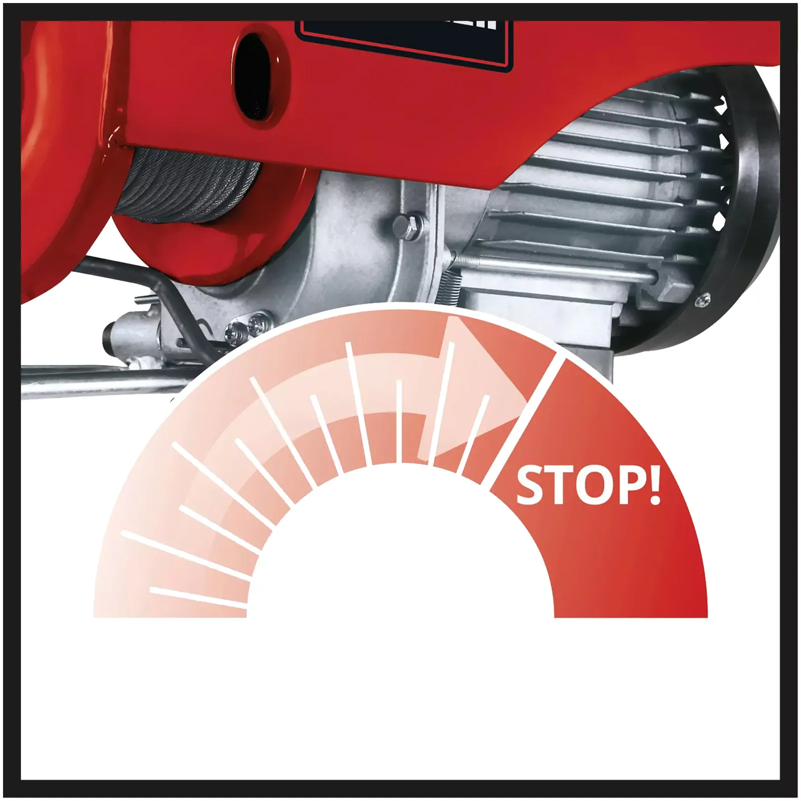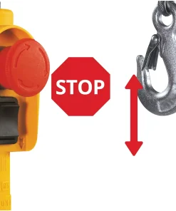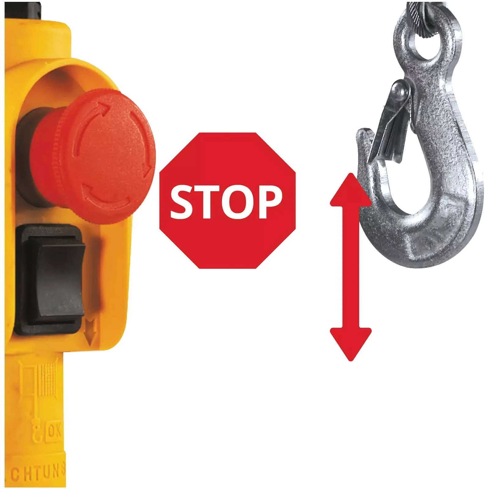 L’interruttore di arresto emergenza blocca immediatamente l’argano in caso di necessità, mentre il dispositivo di sicurezza sul gancio impedisce cadute accidentali.