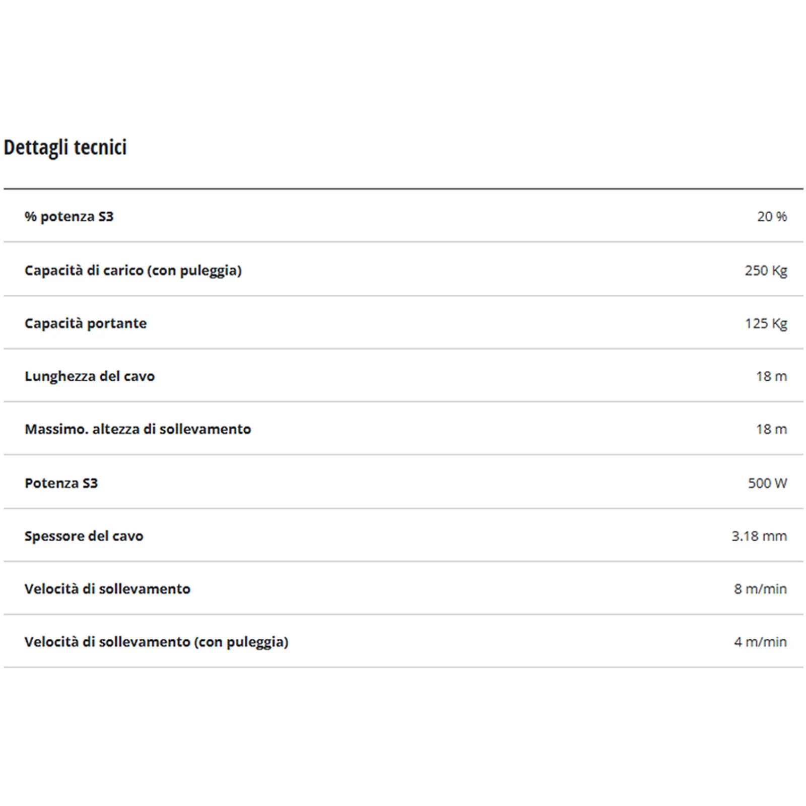 Dotato di un cavo in acciaio da 18 metri (Ø3,2mm), il TC-EH 250-18 permette di raggiungere altezze fino a 18 metri senza rullo guida, o 9 metri con il rullo installato (che raddoppia la portata a 250 kg).