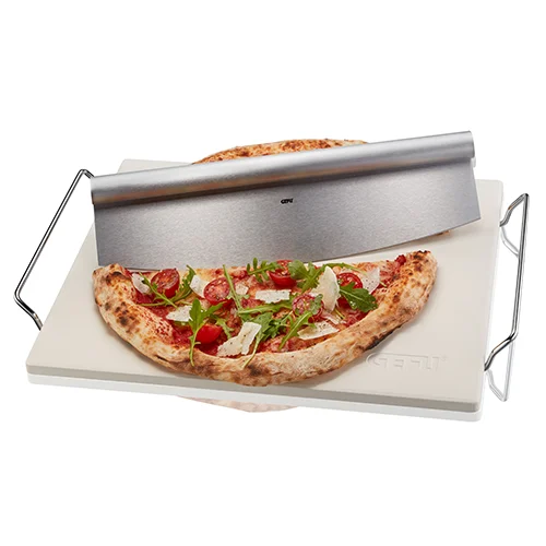 La pietra per pizza professionale, con il suo pratico supporto, distribuisce uniformemente il calore e assorbe l’umidità. Il risultato è una base deliziosamente croccante. La mezzaluna affilata ed extra-large taglia senza fatica la pizza.