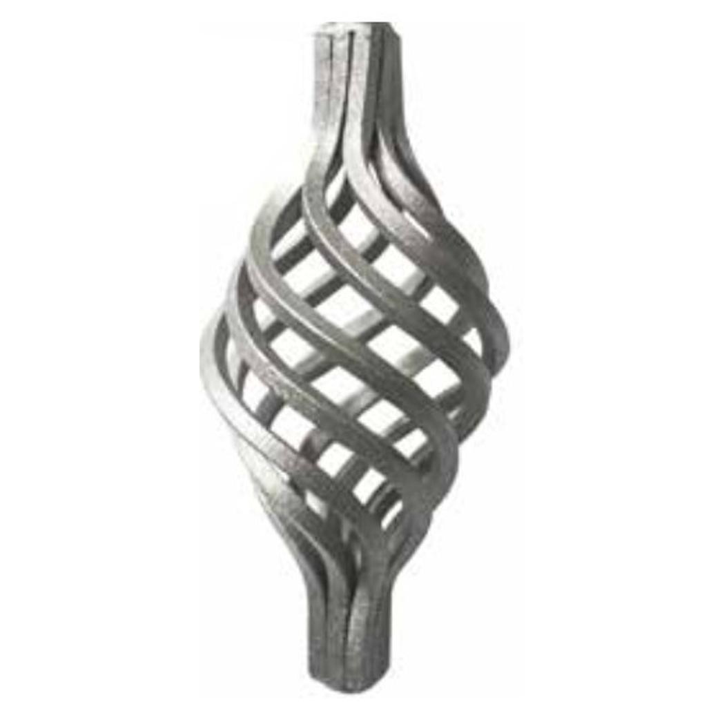 Pigna in ferro battuto anche denominata cipolla o bomba realizzata tramite un segnimento composto da quattro prtrfoli di ferro in quadralino 8×8 mm saldati nell’estremita e posto su un tornio che in senzo contrario, effettua un determinato numeri di giri di una estremità rispetto all’opposta bloccata, deformando verso l’esterno i profili quadri creando una ovale delle dimensioni desiderate.