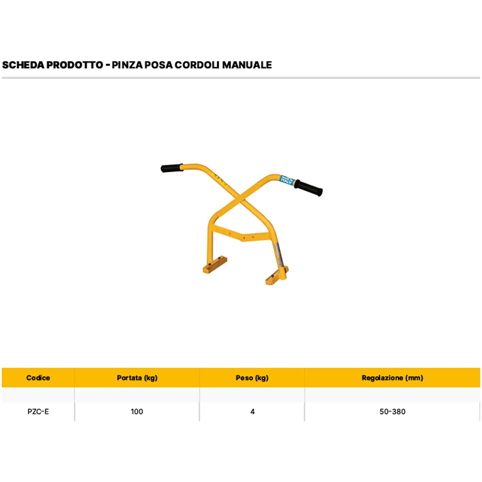La portata massima della pinza è di 100 kg, rendendola adatta a diversi tipi di cordoli, sia leggeri che pesanti.