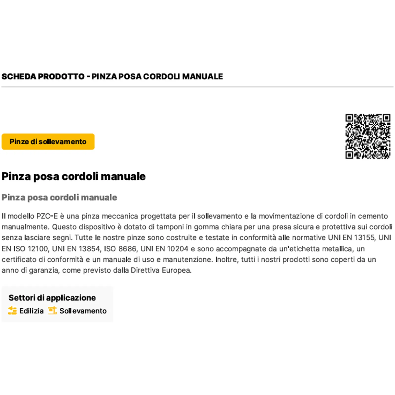 Tutti i prodotti BOSCARO, inclusa la pinza PZC-E, sono costruiti e testati secondo le più severe normative di sicurezza, tra cui UNI EN 13155, UNI EN ISO 12100, UNI EN 13854, ISO 8686 e UNI EN 10204.