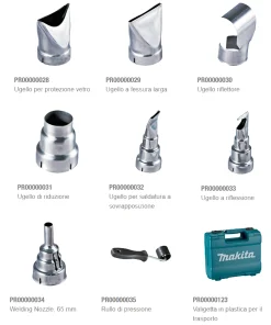 Il termo-soffiatore viene fornito con: 7 uggelli e valigetta in plastica per riporre la pistola ed agevolare il trasporto.