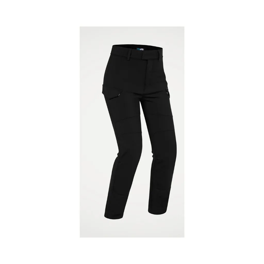 - Tasche laterali sulle gambe chiuse con cerniera pressofusa e patta più bottone automatico nascosto di sicurezza