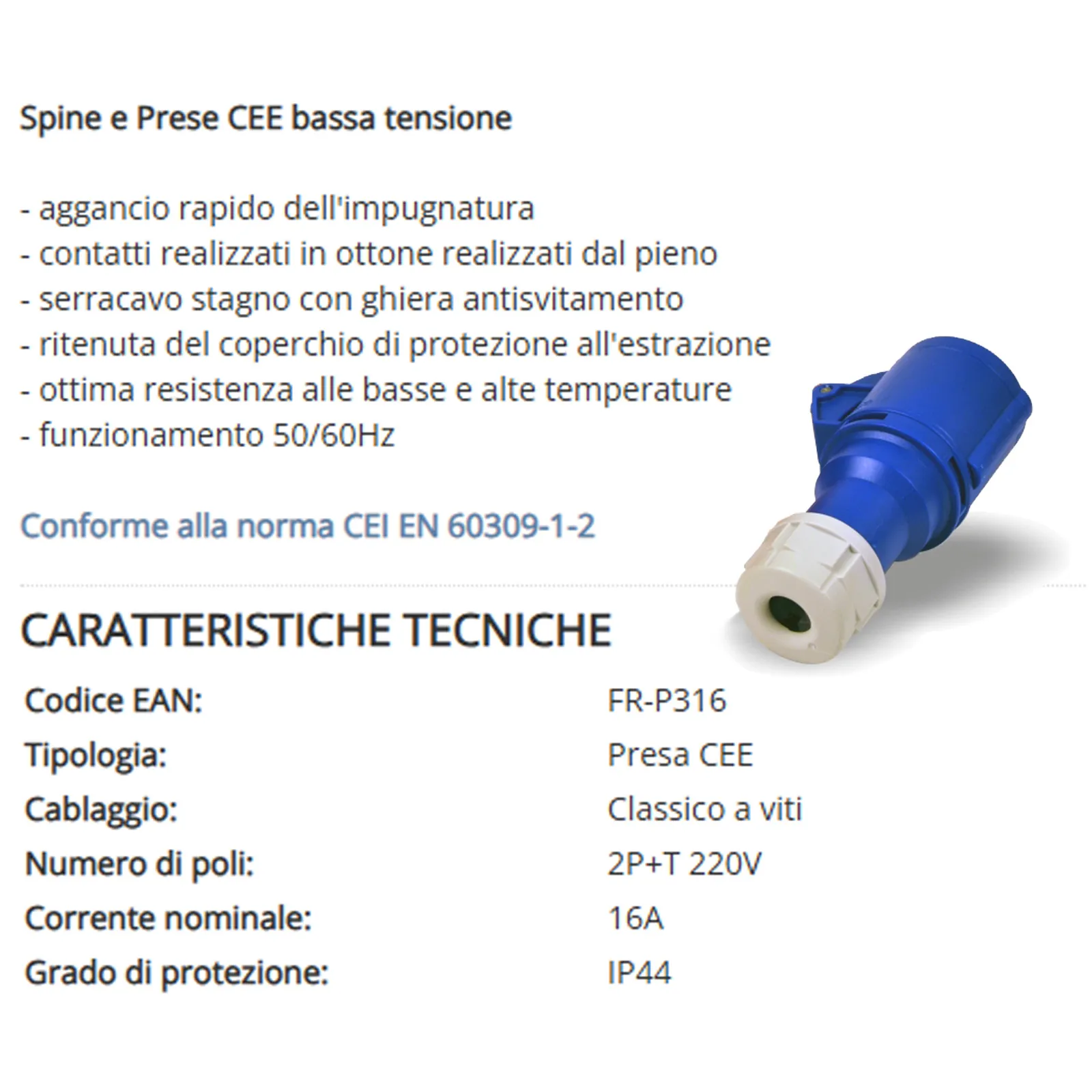 Questa presa CEE 2P+T 16A è progettata per offrire massima praticità e affidabilità nell’utilizzo professionale.