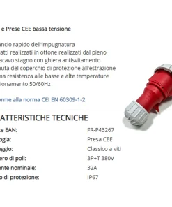 Questa presa trifase CEE 3P+T 32A bassa tensione è progettata per offrire massima praticità e affidabilità nell’utilizzo professionale.