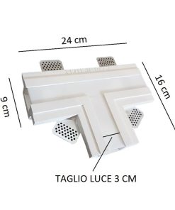 Profilo a T, ad incasso in gesso a scomparsa totale per raccordo a tre vie di tagli di luce. Un raccordo che serve per unire profili e creare elementi e disegni più complessi, in linea con le più attuali tendenze nel design di interni.