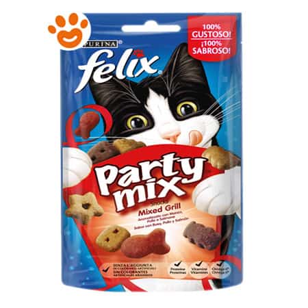 Condividi più momenti piacevoli e divertenti insieme al tuo gatto con Felix Party Mix. Contiene un irresistibile mix colorato di snack dagli aromi invitanti, deliziosi sapori e forme divertenti. Non è tutto! Felix Party Mix contiene proteine, vitamine e acidi grassi omega 6 per aiutare il tuo gatto a vivere una vita sana e felice. Felix Party Mix è disponibile in un’ampia gamma di varietà. Provalo e fai gustare al tuo gatto queste irresistibili varietà!