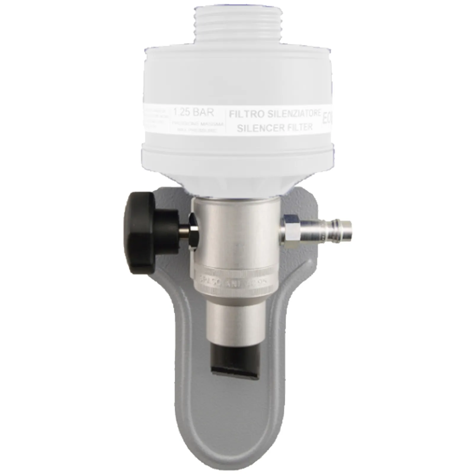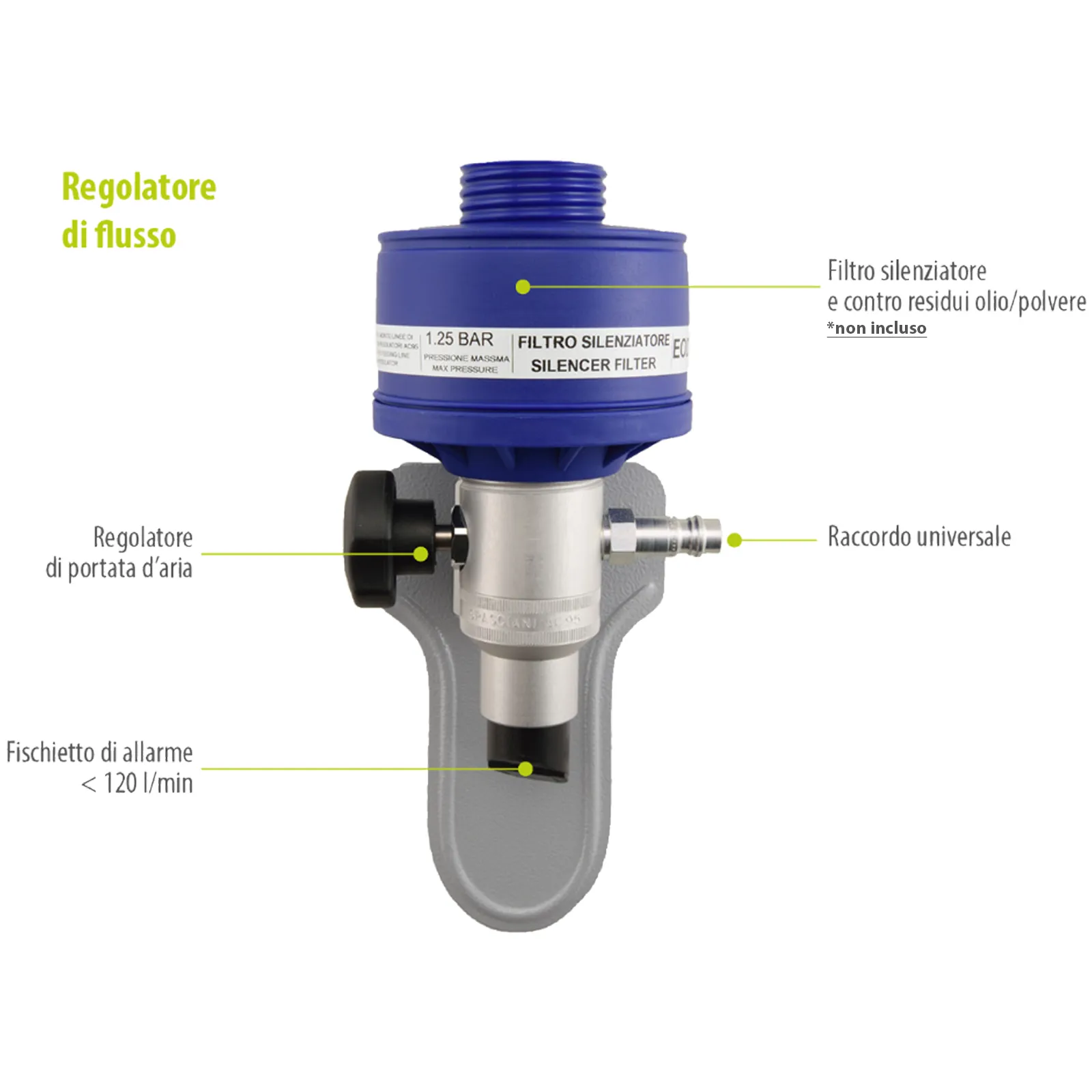 Il regolatore di flusso AC95 è dotato di raccordi rapidi per il collegamento al tubo di alimentazione e provvede a fornire all’operatore un flusso continuo di aria che può essere modificato dall’utilizzatore agendo sull’apposito volantino.