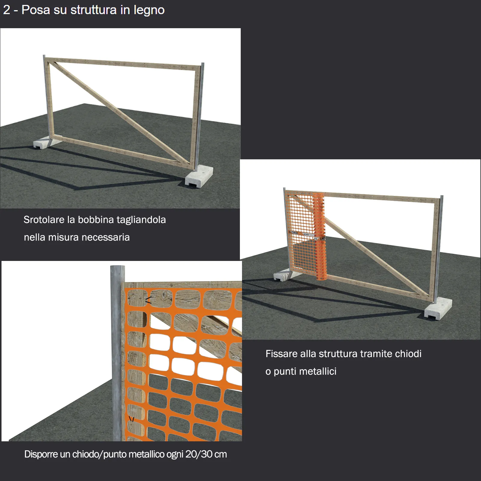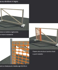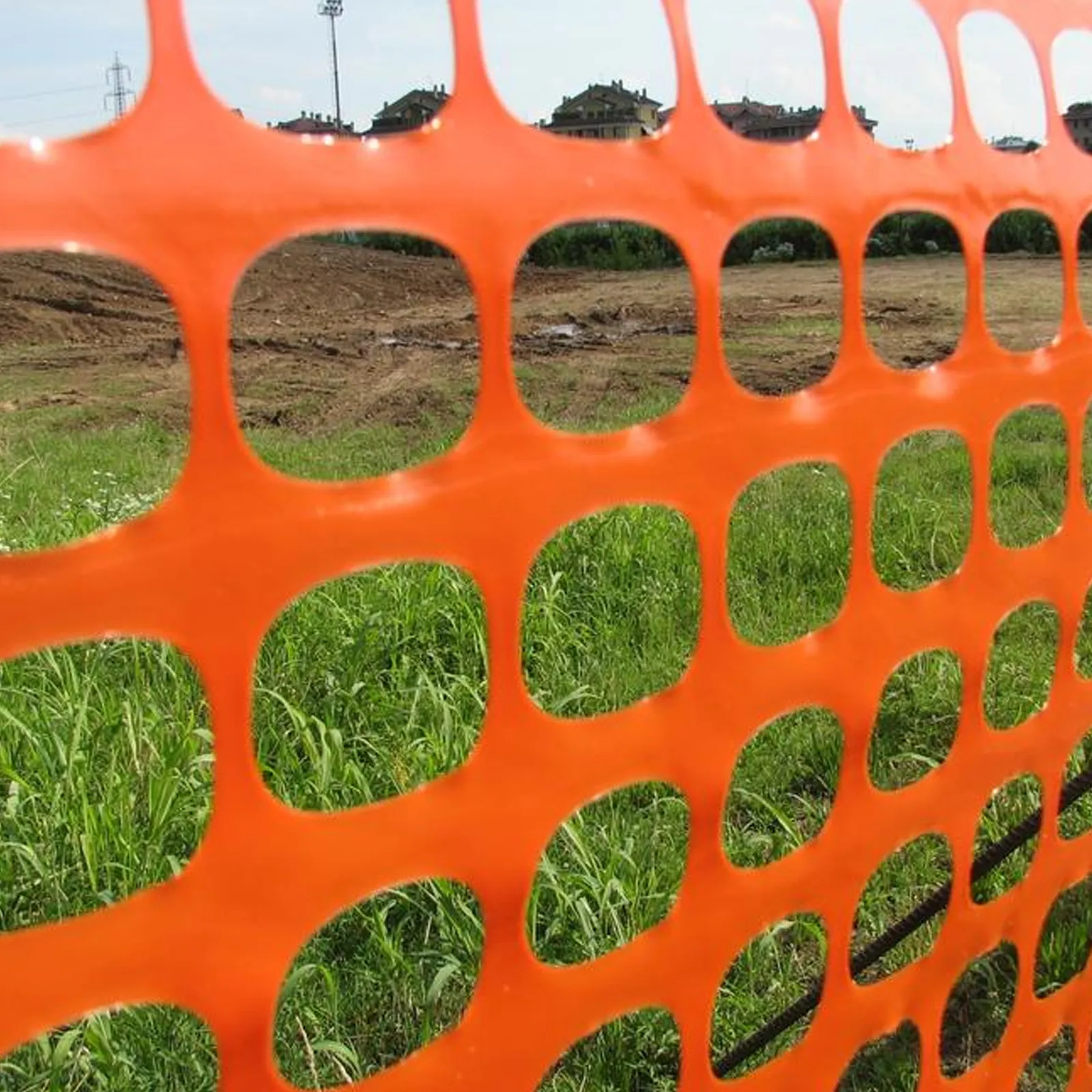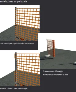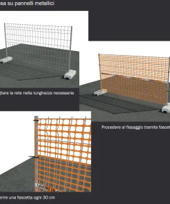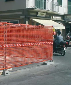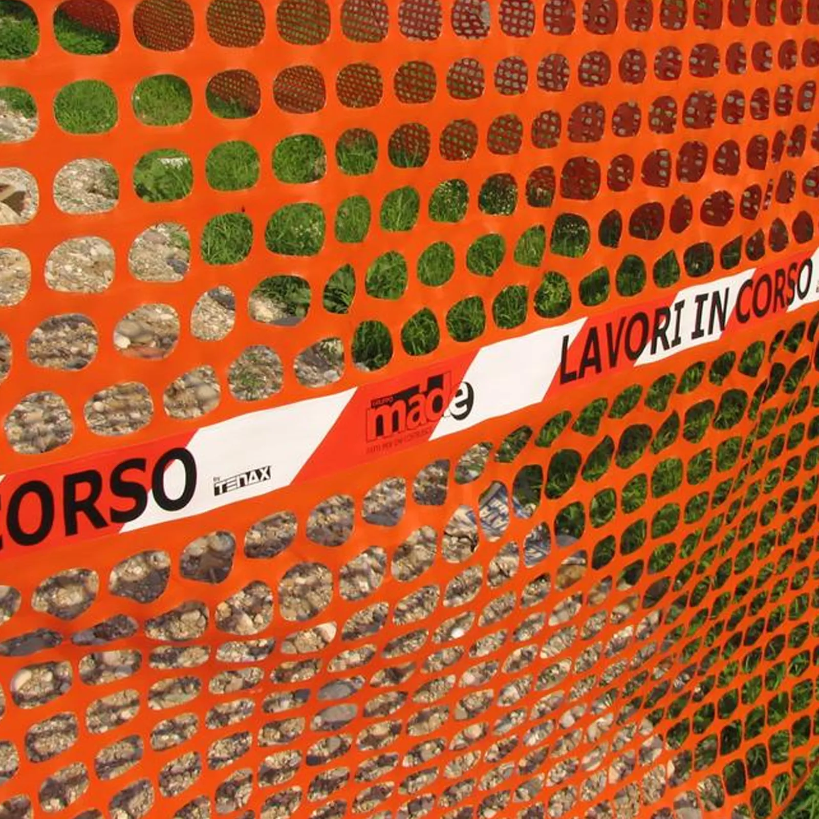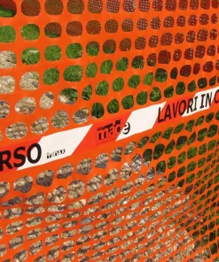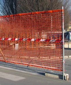 Rete da cantiere estrusa in polietilene (HDPE) a maglia quadrangolare con bordo e fascia centrale rifrangente antistrappo.