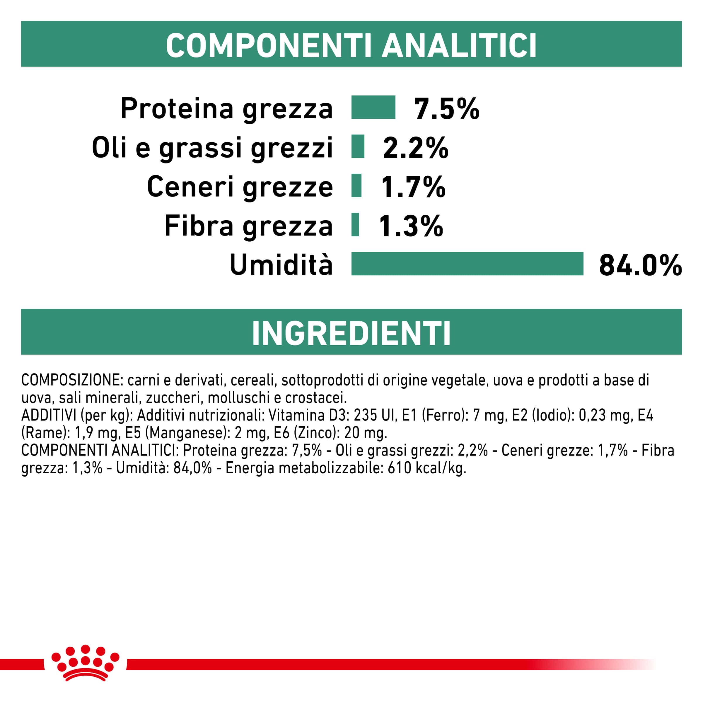 Componenti analitici: Proteina grezza 7.5%, Oli e grassi grezzi 2.2%, Ceneri grezze 1.7%, Fibra grezza 1.3%, Umidità 84.0%, Energia Metabolizzabile 610KCal/Kg.