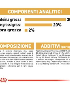 Proteina grezza: 30,0% – Oli e grassi grezzi: 20,0% – Ceneri grezze: 7,2% – Fibra grezza: 2,0%.