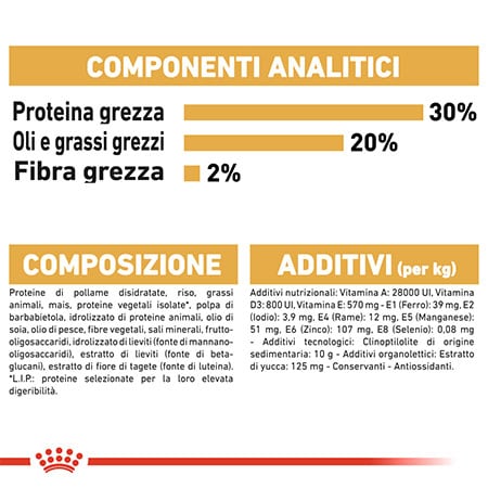 proteine di pollame disidratate, riso, grassi animali, mais, proteine vegetali isolate*, polpa di barbabietola, idrolizzato di proteine animali, olio di soia, olio di pesce, fibre vegetali, sali minerali, frutto-oligosaccaridi, idrolizzato di lieviti (fonte di mannano-oligosaccaridi), estratto di lieviti (fonte di beta-glucani), estratto di fiore di Tagete (fonte di luteina).