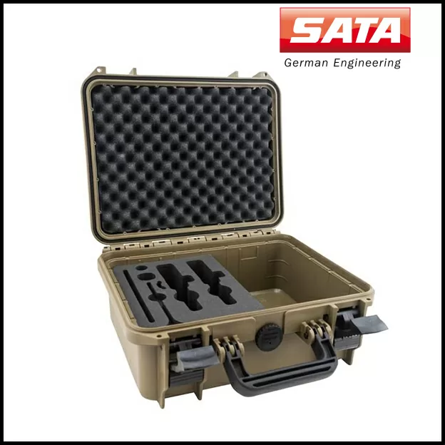 Valigetta SATA, umbra (30 x 23 x 13 cm), con impronta “SATAjet X 5500”, compreso inserto per 2 pistole di verniciatura, materiale: plastica