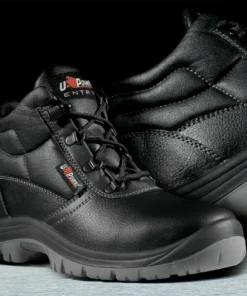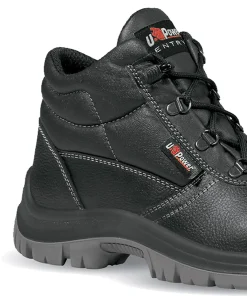 Scarpa antinfortunistica alta e sicura della linea Entry U Power modello SAFE, con tomaia in pelle stampata, idrorepellente, puntale in acciaio, anti-perforazione, antiscivolo, lamina in acciaio ergonomica e suola PU/PU, RS S3 SRC.