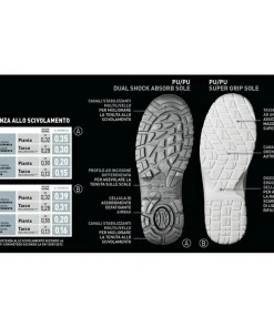 Suola in PU/PU per un comfort ottimale e con coefficiente di resistenza allo scivolamento eccezionale.