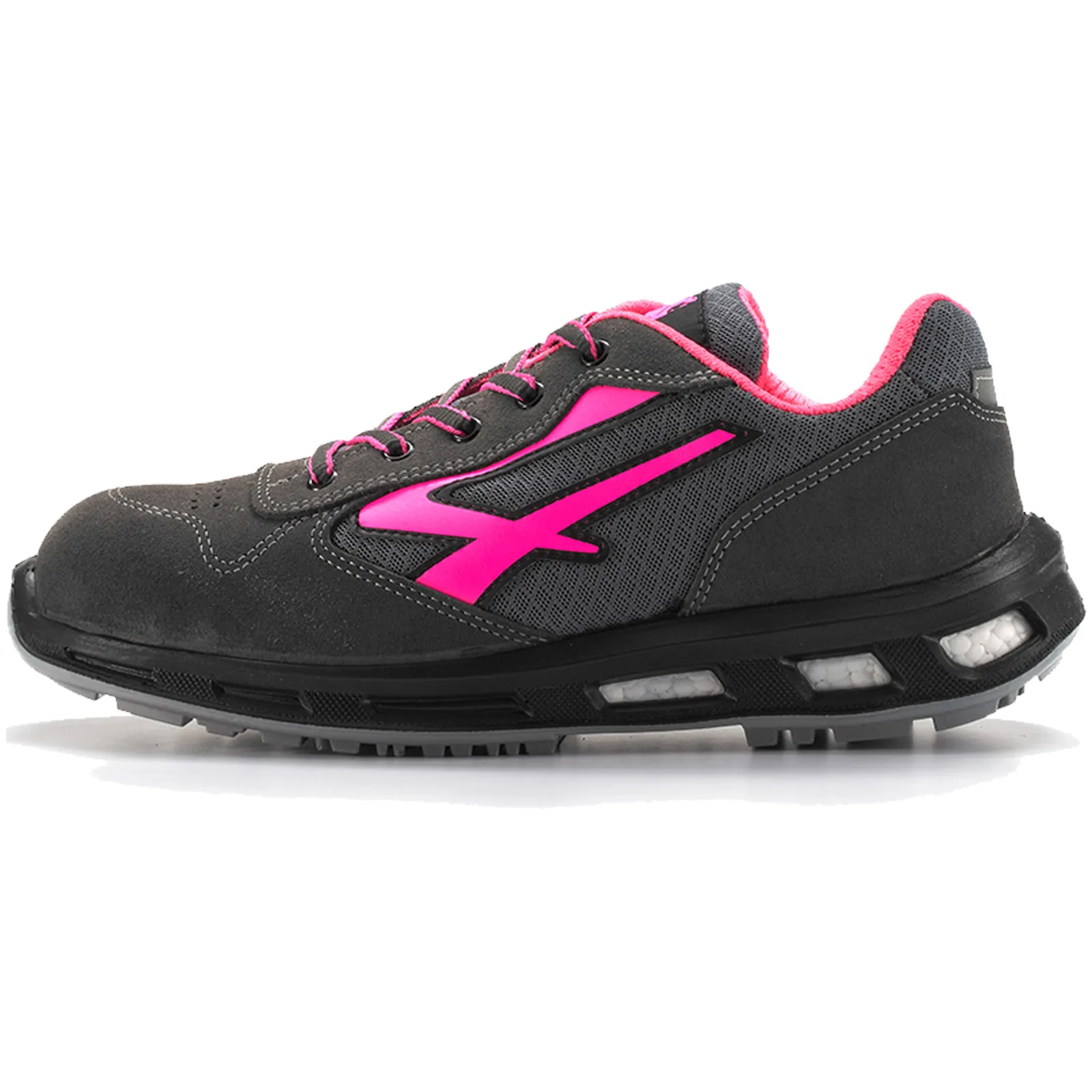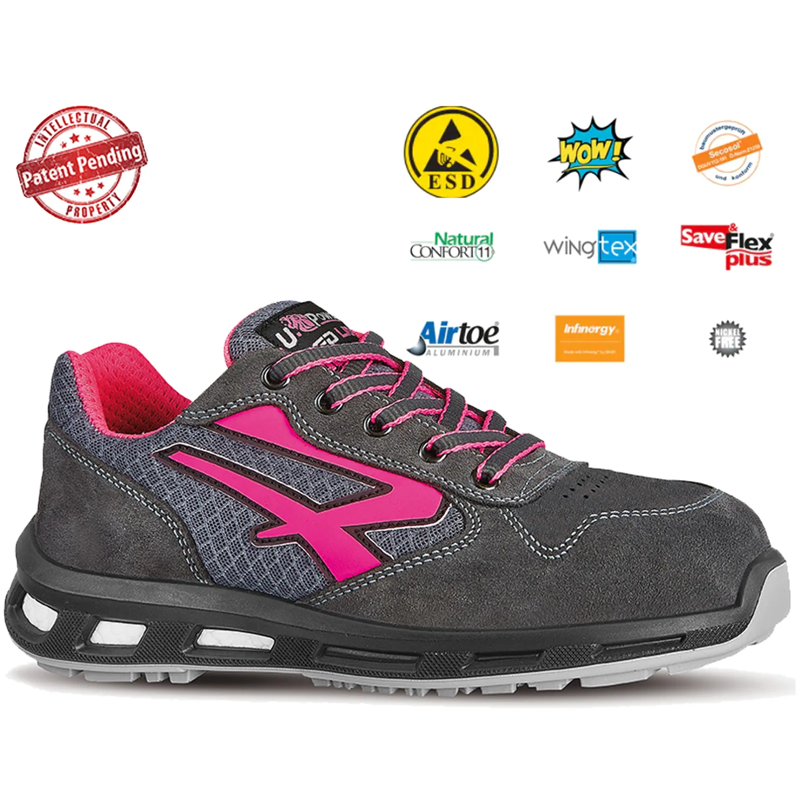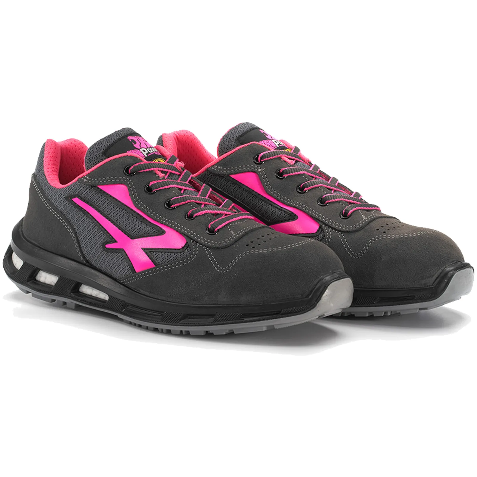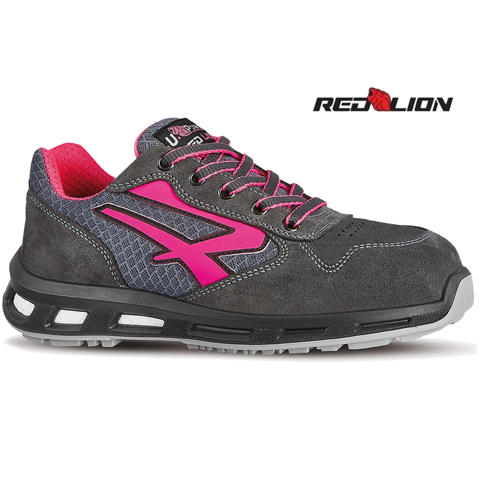 Scarpe antinfortunistiche basse, leggere e comode u power della linea Red Lion, con tomaia in nylon ultra traspiranti e morbida pelle scamosciata, puntale in alluminio, anti-perforazione, antiscivolo e suola PU/PU infinergy, S1P SRC ESD.