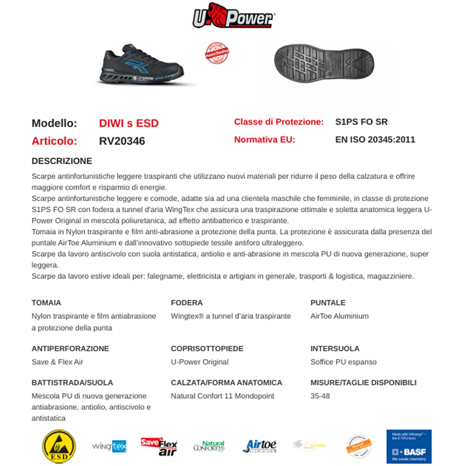 – Suola antistatica, antiolio e anti-abrasione in mescola PU di nuova generazione, super leggera