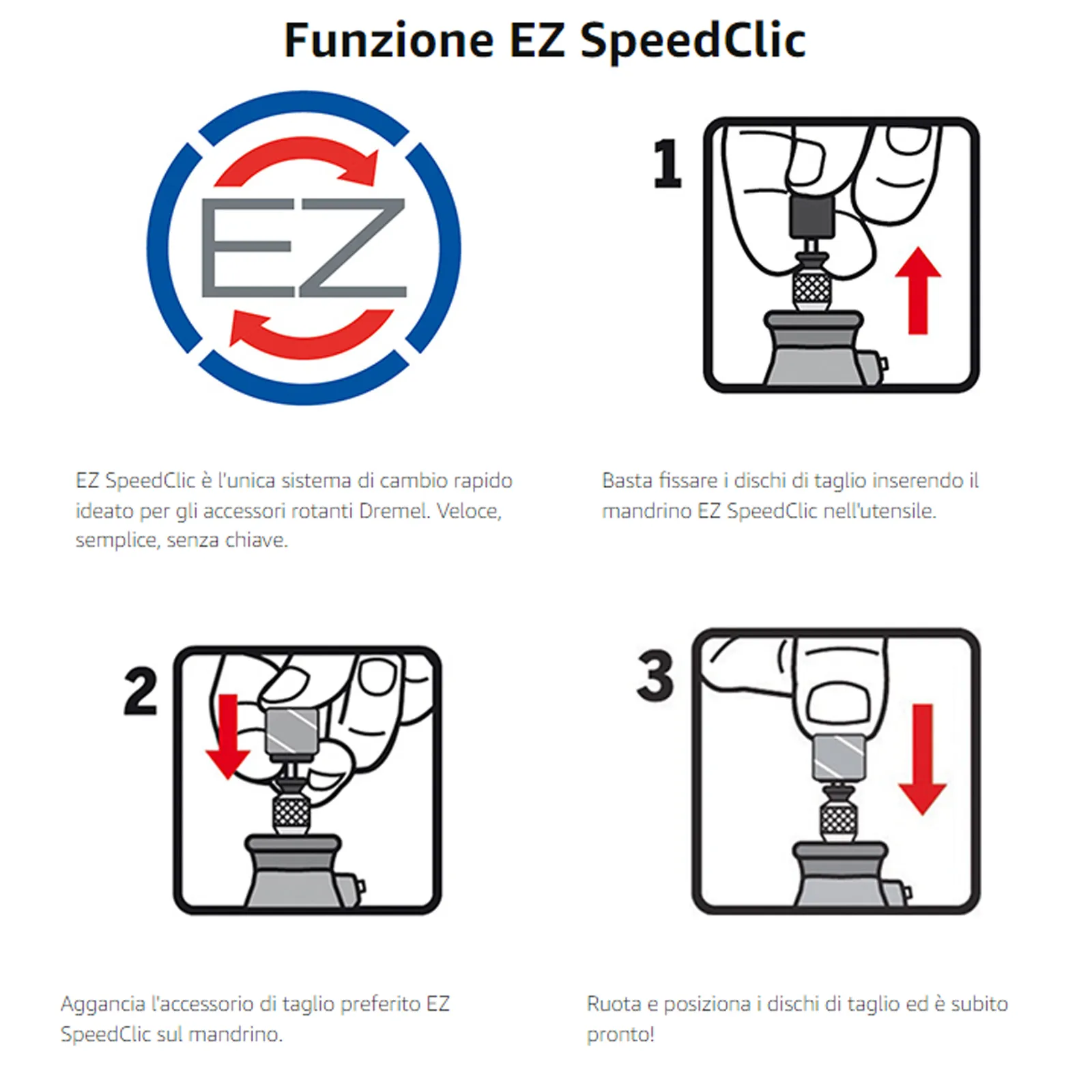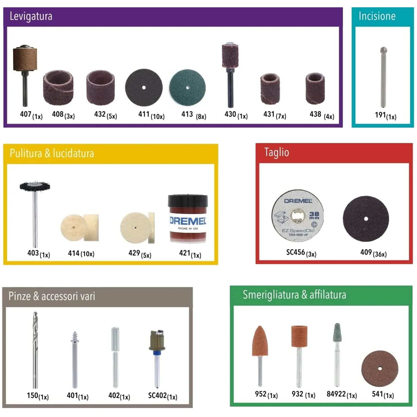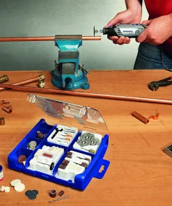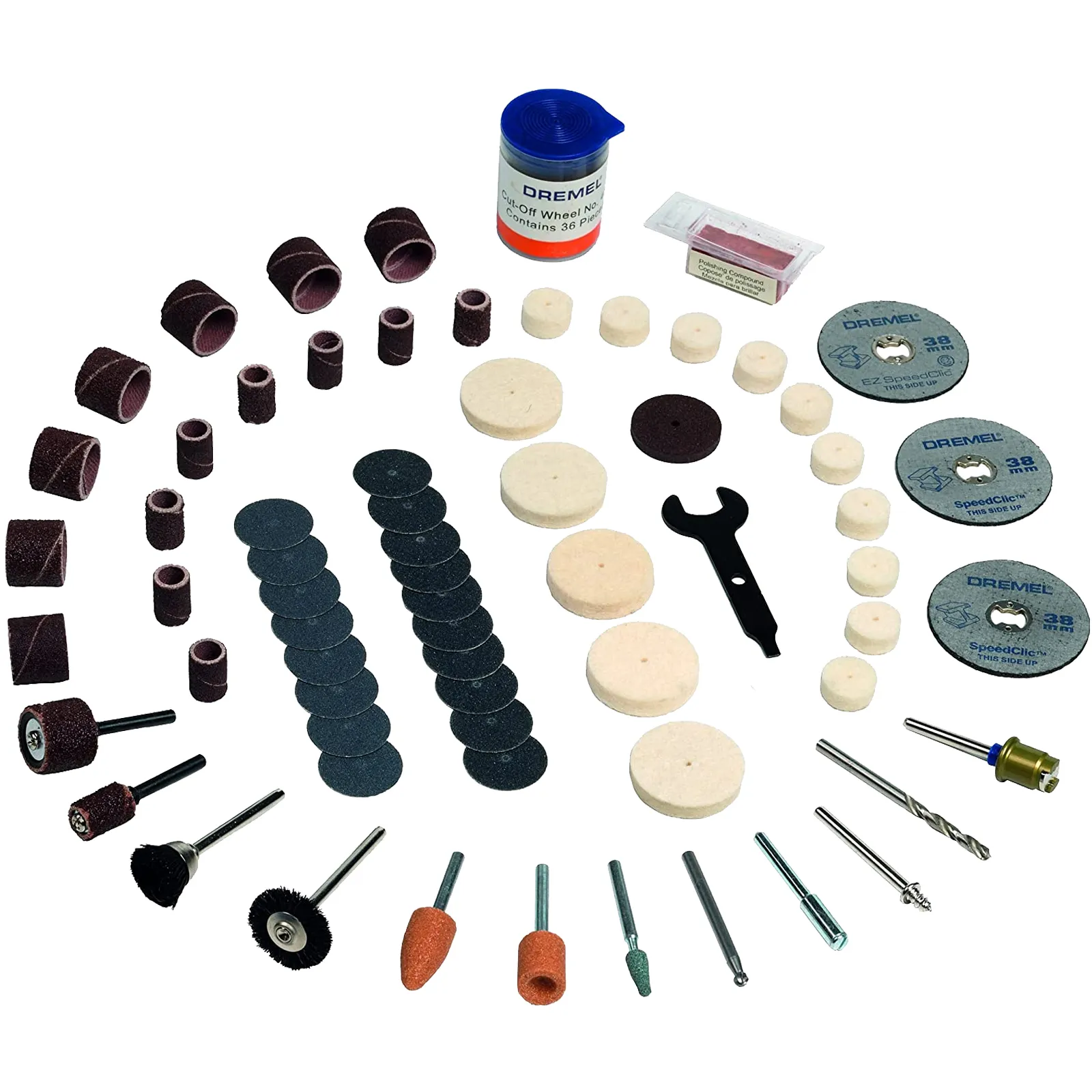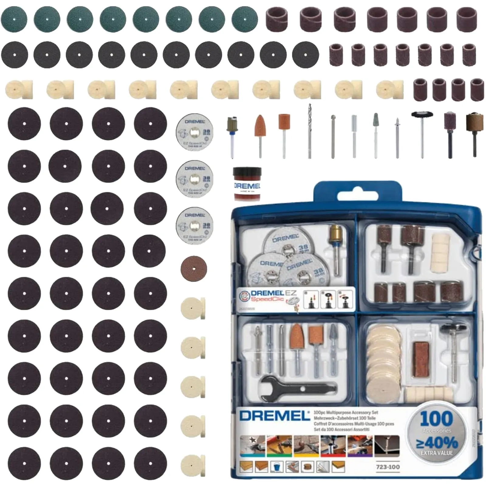 Il set di accessori multiuso da 100 pezzi Dremel contiene 100 accessori originali Dremel di elevata qualità, compresi gli accessori EZ SpeedClic che consentono il rapido e facile cambio degli accessori.