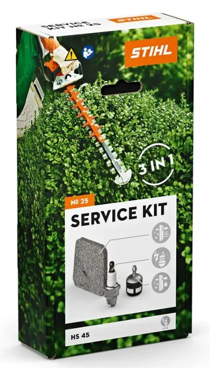 Con i service kit per tosasiepi STIHL, è possibile eseguire autonomamente una semplice manutenzione. Il kit comprende una candela, un filtro carburante e un filtro dell’aria in tessuto non tessuto. Oltre a preservare i componenti dell’attrezzatura da impurità e danni, la manutenzione standard proattiva e regolare prolunga la durata del tosasiepi nel tempo. Oltre alla chiave combinata, già in dotazione con il tosasiepi STIHL, non sono necessari altri utensili per la manutenzione.