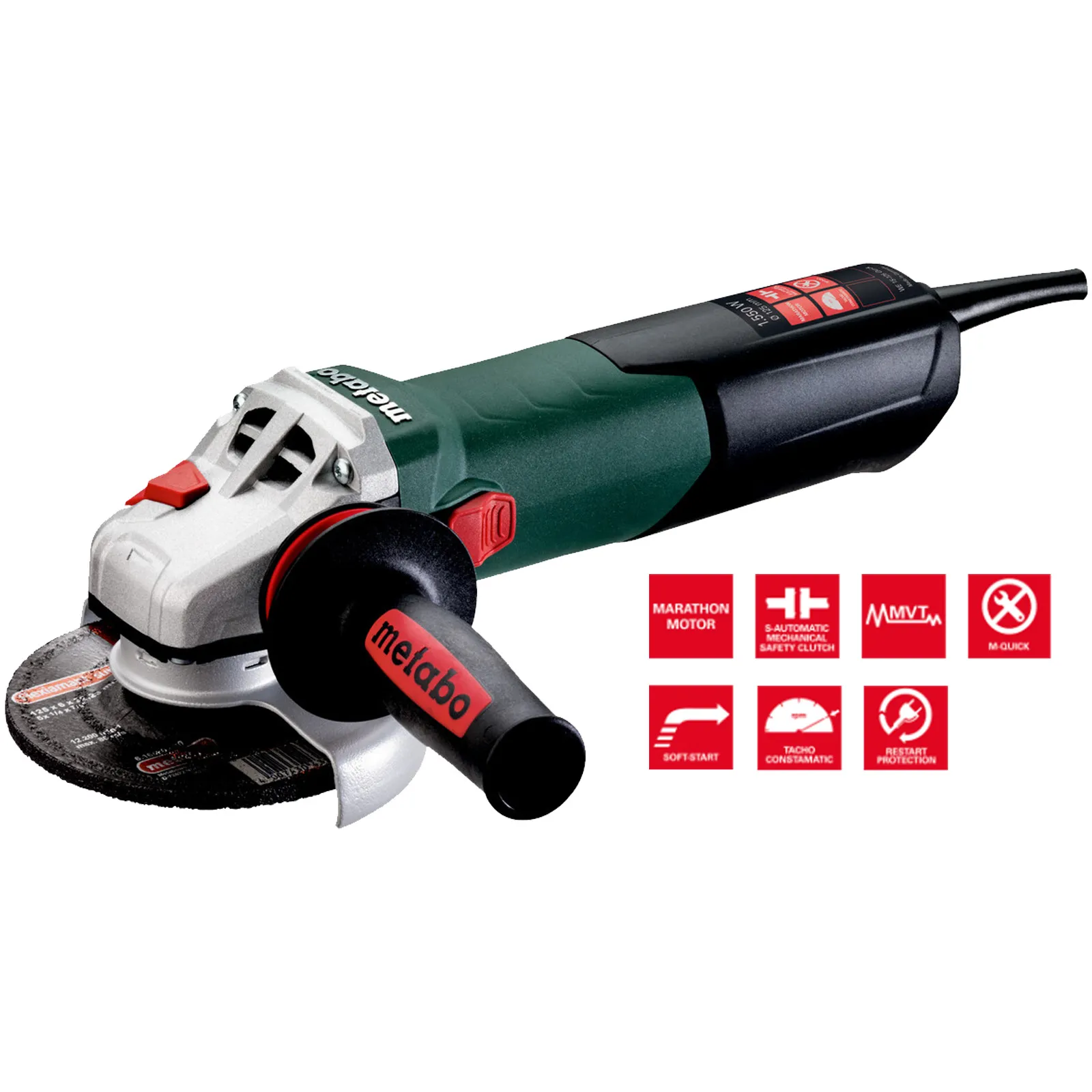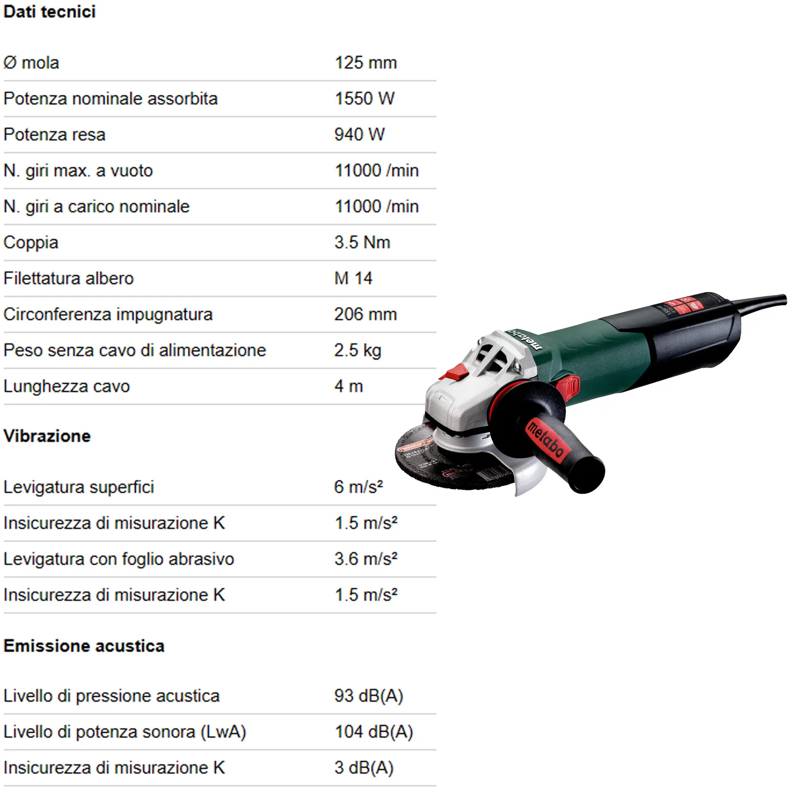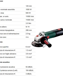 Smerigliatrice angolare elettrica con potenza 1550 Watt per dischi con diametro massimo 125mm, potente e robusta per applicazioni professionali.