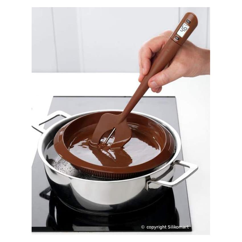 Il thermo choc di silikomart è la spatola in silicone con termometro per il controllo della temperatura (da -40°c a 160°c) di cioccolato fuso, creme, salse, marmellate, sciroppi, meringa all’italiana, etc.