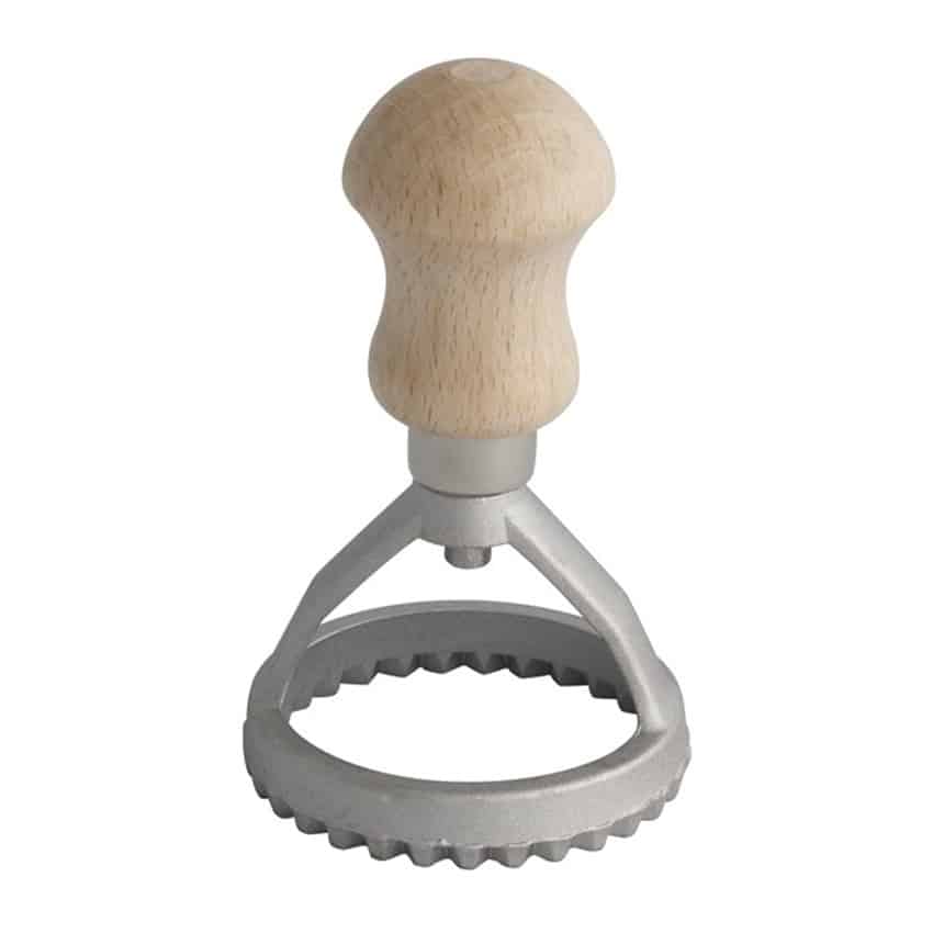 Taglia ravioli tondo in alluminio pressofuso con impugnatura in legno.