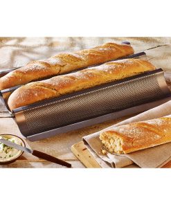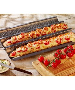 Stampo robusto e di qualità per 3 baguettes 250 g – 300 g, appositamente forato per favorire la cottura uniforme ed ottenere pagnotte perfettamente croccanti. Rivestimento dalle ottime caratteristiche antiaderenti.