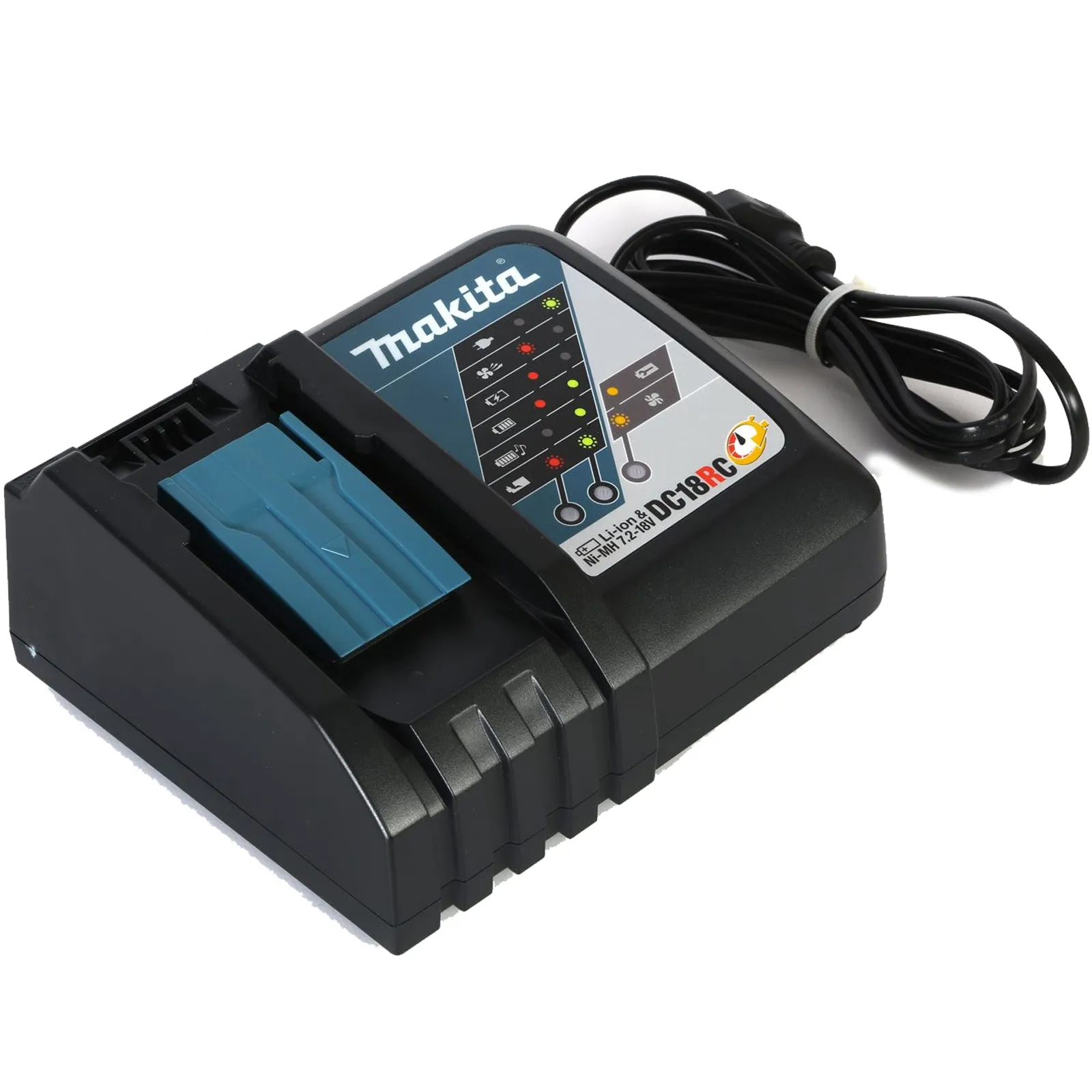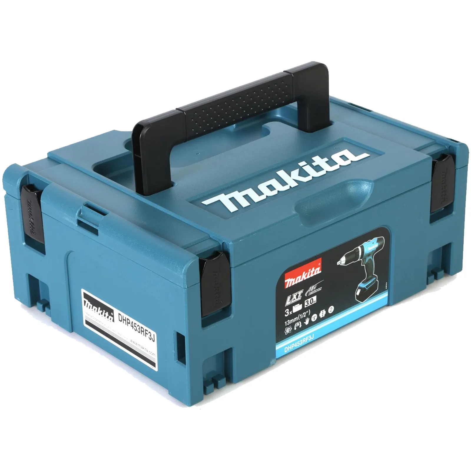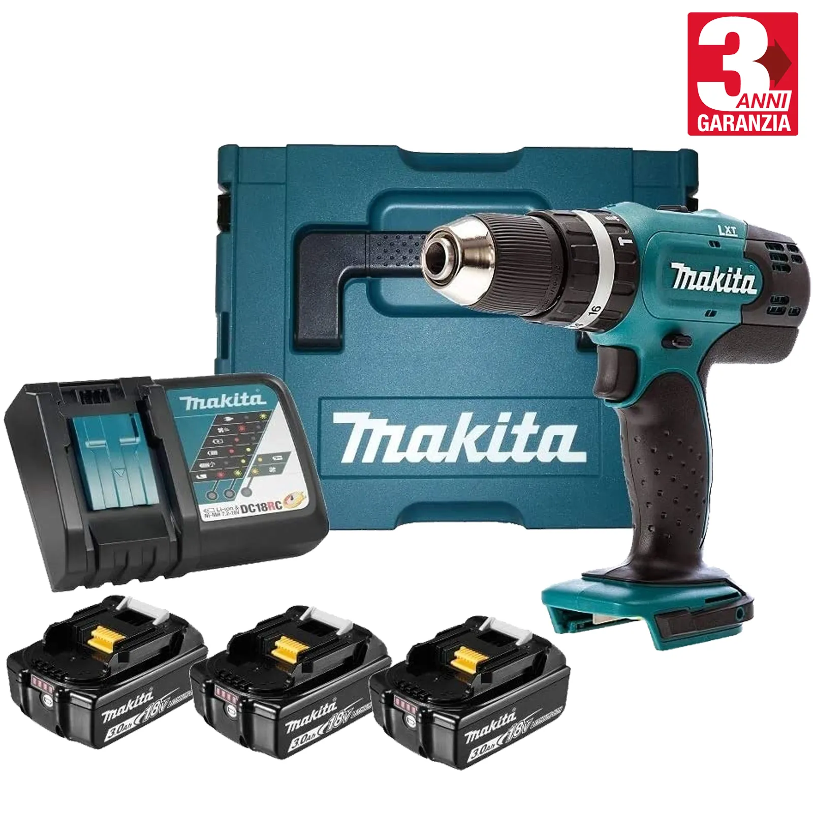 Il trapano viene fornito con 3 batterie 3,0 Ah, caricabatterie rapido ’22 DC18RC e valigetta MAKPAC tipo 2 (821550-0).