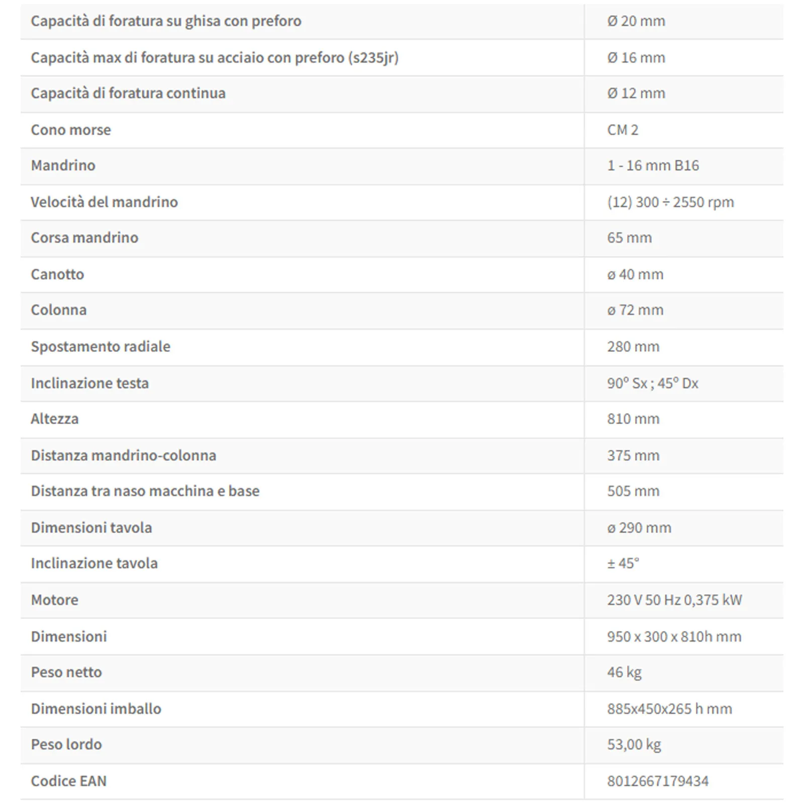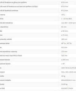 Per le forature continue, la capacità massima è di Ø 12 mm. Il cono morse CM 2 e il mandrino da 1 a 16 mm B16 completano le caratteristiche tecniche, offrendo una gamma ampia di possibilità di lavorazione.