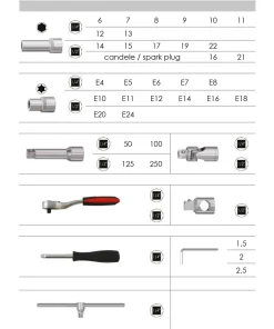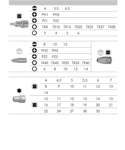 - 18 bussole con inserto: PH1, PH2, PZ1, PZ2, TX8, TX10, TX15, TX20, TX25, TX27, TX30, Taglio 4K Taglio 5,5 , Taglio 6,5 , Esagono 3, Esagono 4, Esagono 5, Esagono 6
