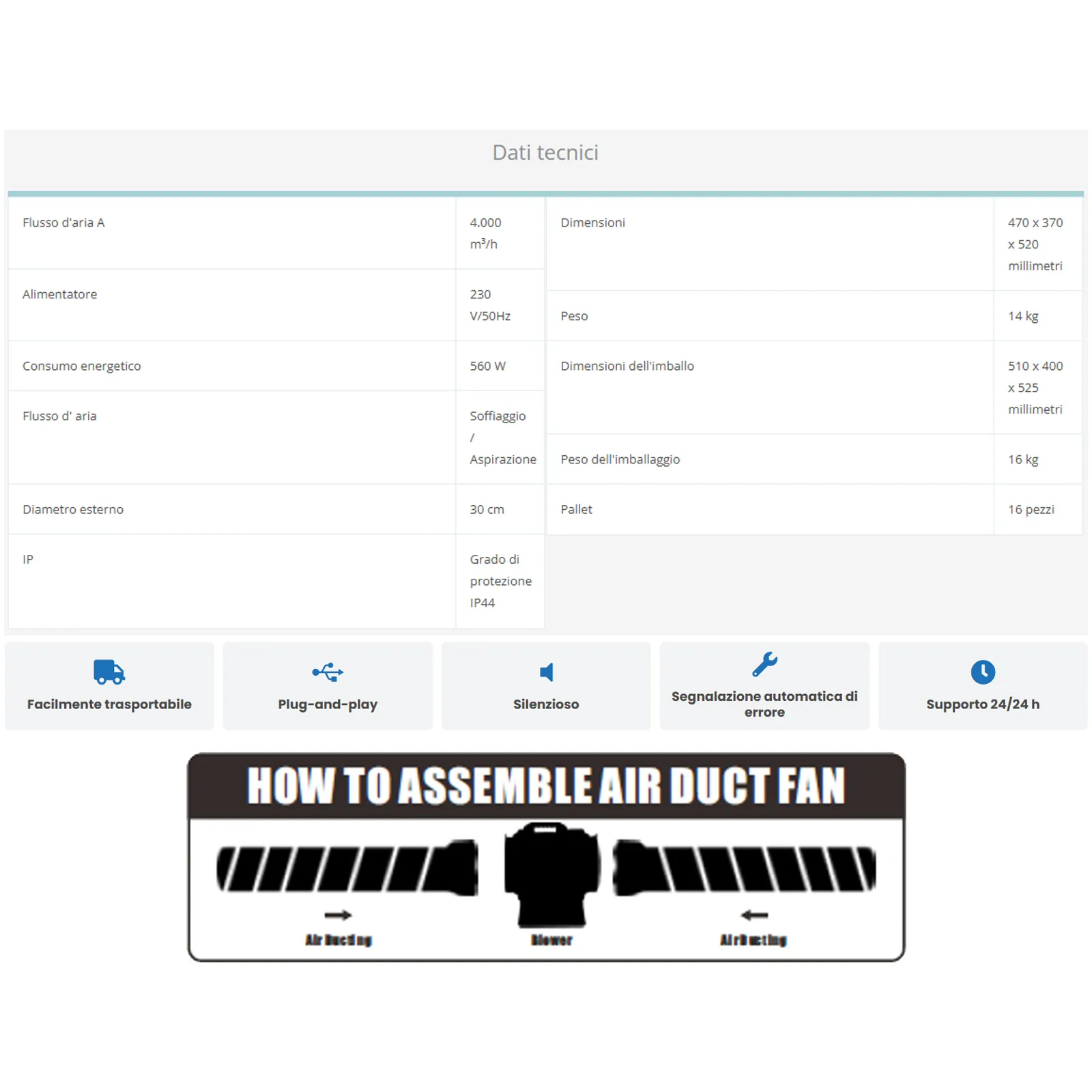 Inoltre, è possibile acquistare separatamente un tubo di canalizzazione flessibile da 7,6 metri e un kit di canalizzazione a tre tubi, per indirizzare il flusso d’aria in modo mirato.