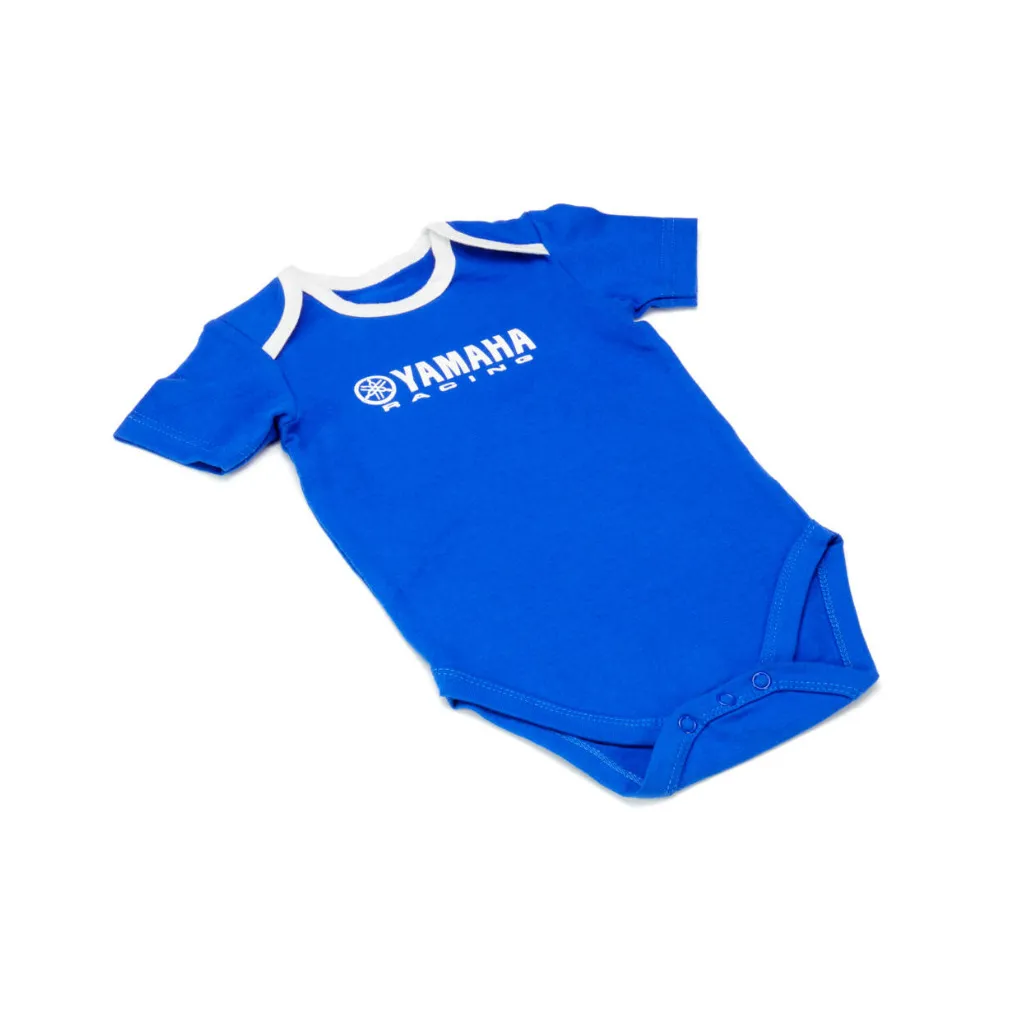 Bellissimo Yamaha Paddock Blue baby romper in colore blu con maniche corte. Logo Yamaha Racing molto rappresentativo sul petto.