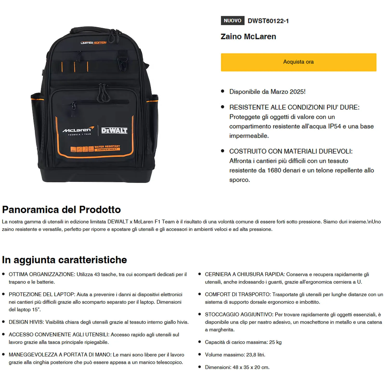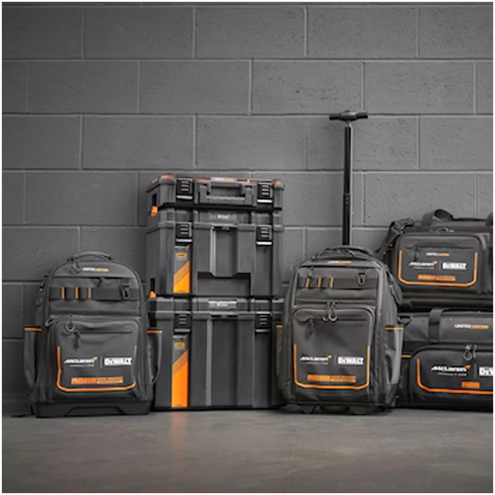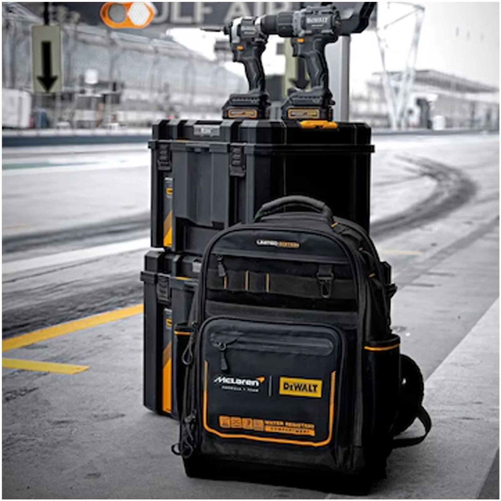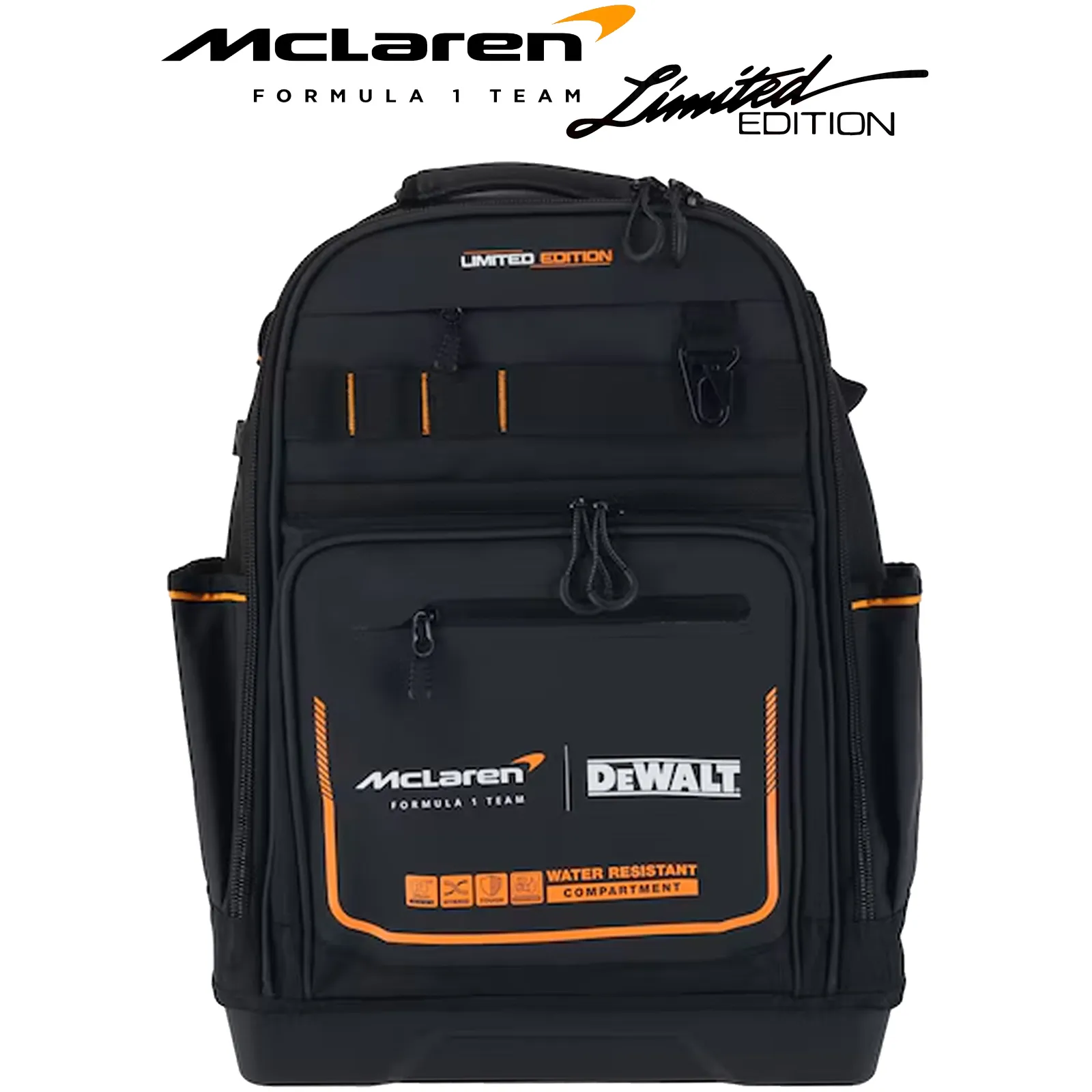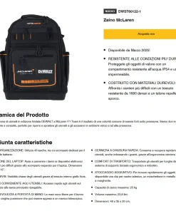 Zaino Portautensili DEWALT 24 Litri Resistente 43 Tasche con Porta Laptop 15″ Impermeabile IP54 Edizione Limitata McLaren F1 Team modello DWST60122-1