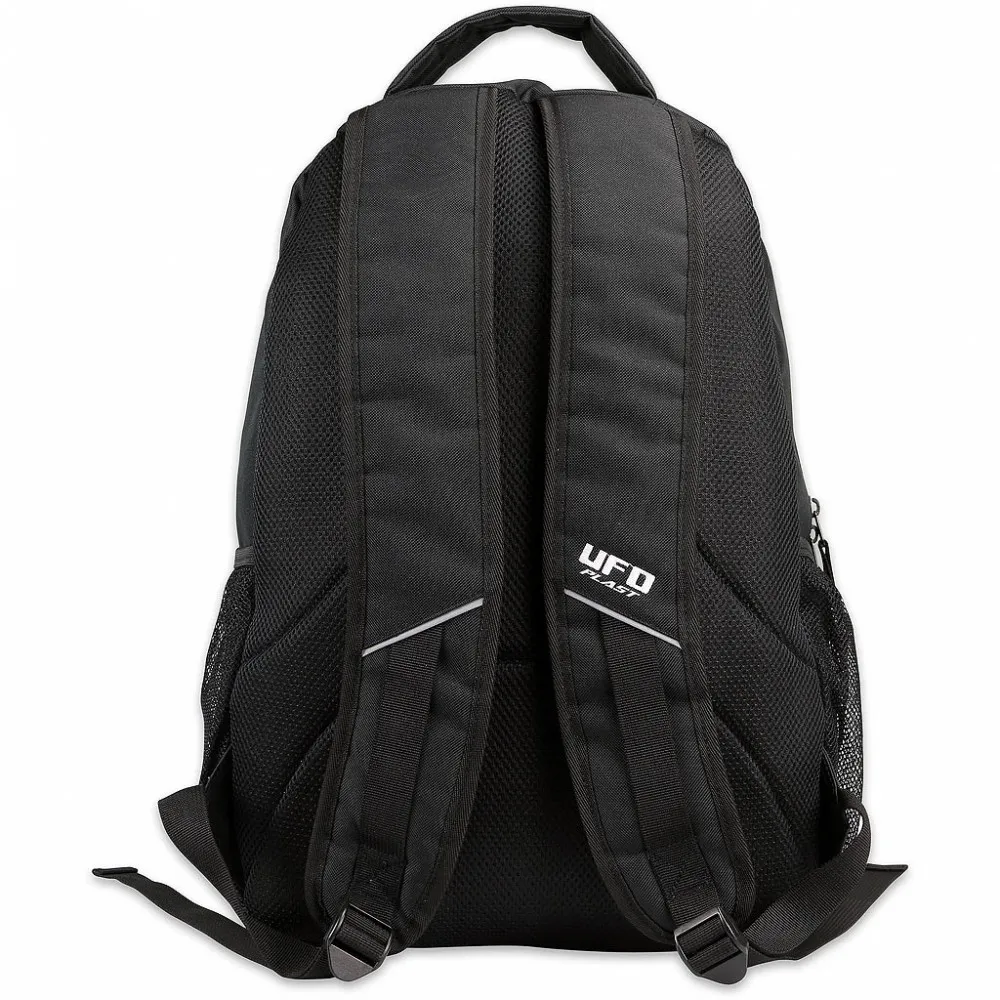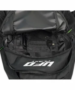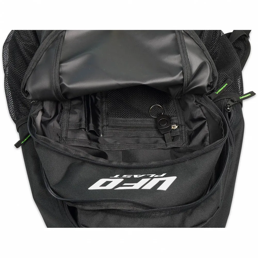 Zaino marca Ufoplast, nero e verde, portaborraccia laterale in retina, n. 3 scomparti con cerniera, vari scomparti nella parte interna.